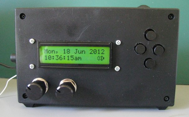 The following picture shows the completed clock prototype, built into a UB1 jiffy box with the radio. Being the prototype, it is a little rough and ready, but rugged enough to take a pounding each morning as a bedside alarm clock: